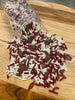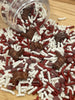 Ingredients: Sugar, Corn Starch, Hydroxypropl Distarch Phosphate, Hydrogenated Palm Oil, Water, Gum Arabic, Shellac, Carnauba Wax, Xanthan Gum, Dextrin, Carnauba Wax, Soy Lecithin, Tapioca Starch, Glycerin, Artificial Flavor, Titanium Dioxide, Artificial Colors (FD&C Blue #1, FD&C Red #3, FD&C Red #40 Yellow 5 & 6). Dextrose, magnesium sterate, confectioner's glaze, caramel 1